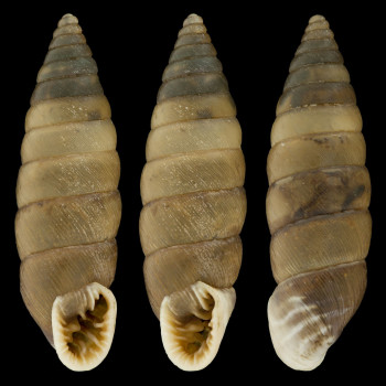 "Concha cónica-fusiforme, alargada y esbelta, de color córneo claro a pardo. Abertura ovalada y obtusa inferiormente [...] . Última vuelta comprimida hacia la base".