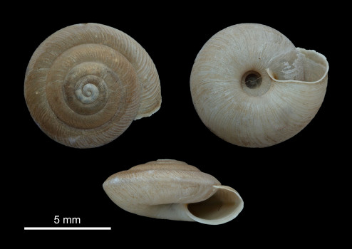 "Concha opaca, lenticular y aplanada, de color pardo terroso uniforme [...]. Última vuelta aquillada en su periferia, poco más ancha que la anterior y apenas descendente hacia la abertura".