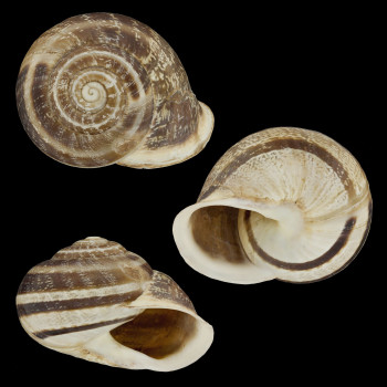 "Concha globulosa, sólida, opaca y brillante, de color pardo claro o amarillento, unicolor o con cuatro o cinco bandas oscuras, que a veces se fusionan [...]. Última vuelta redondeada en su periferia y descendente hacia la abertura".