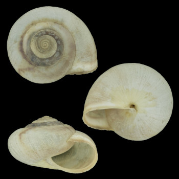 "Concha globulosa algo deprimida, sólida, mate y translúcida casi transparente, color blanco o crema unicolor. En ocasiones pardo rojiza hacia la abertura, o con una banda blanquecina anular [...]. Última vuelta redondeada en su periferia y ligeramente descendente hacia la abertura".
